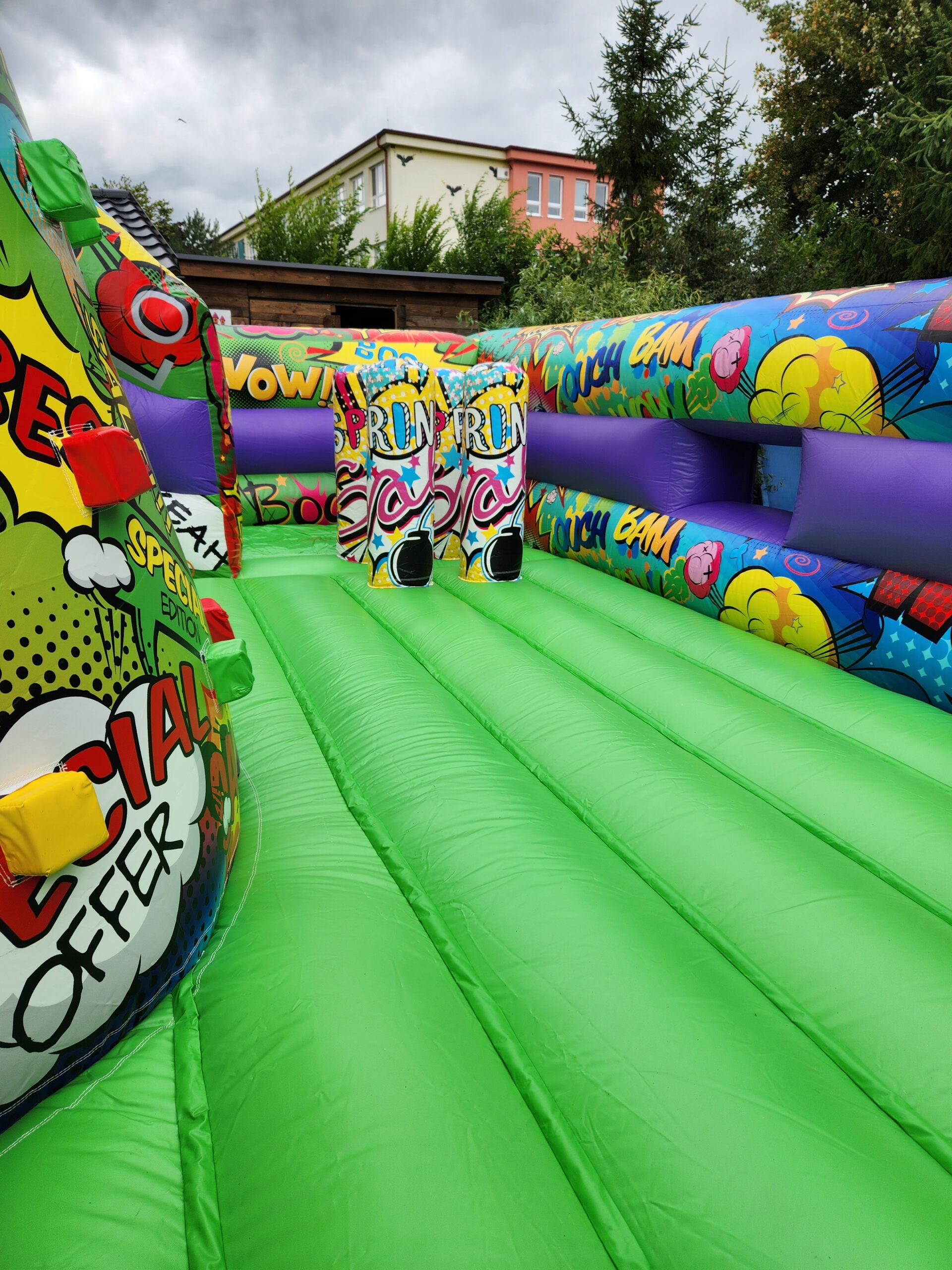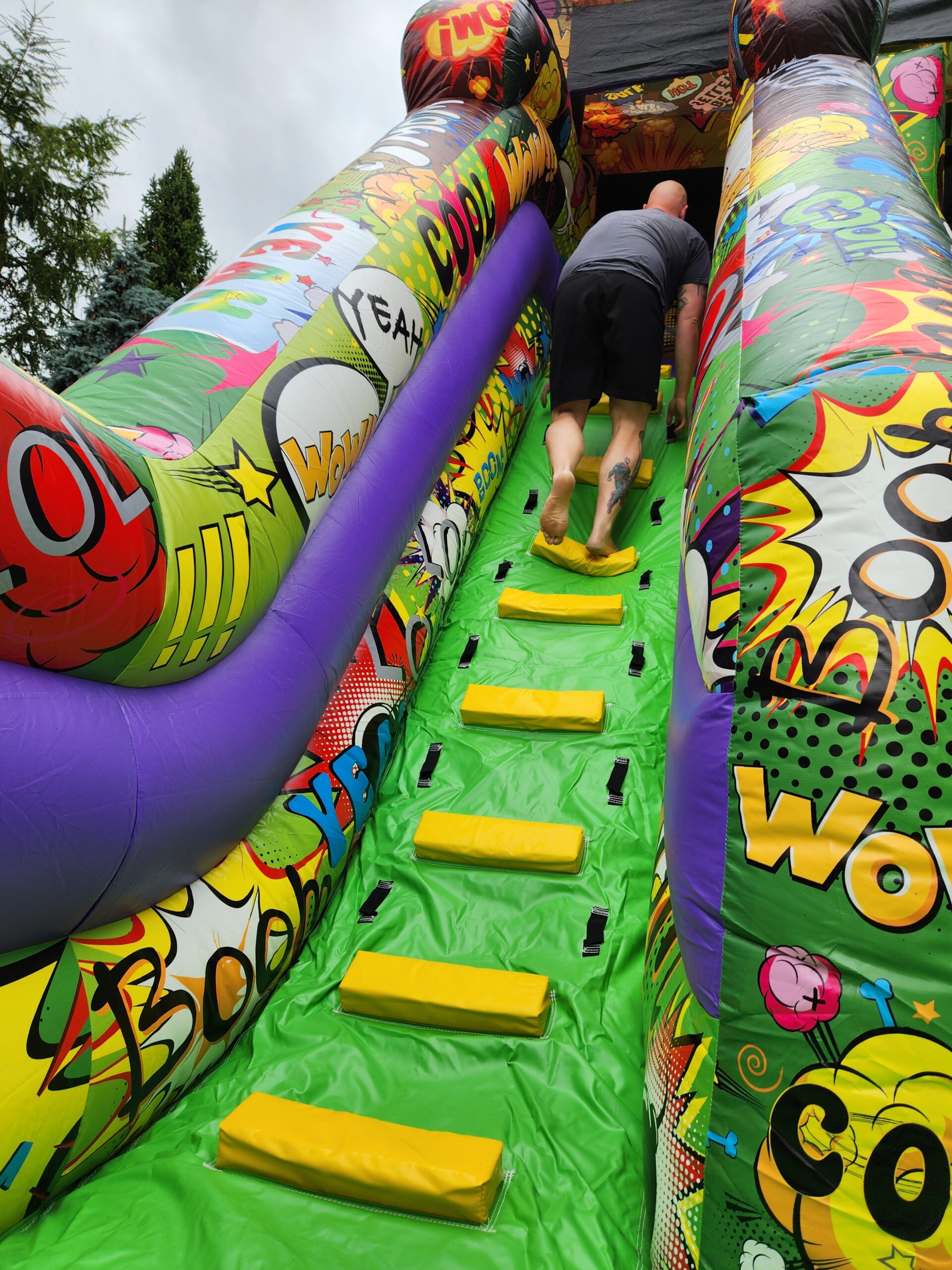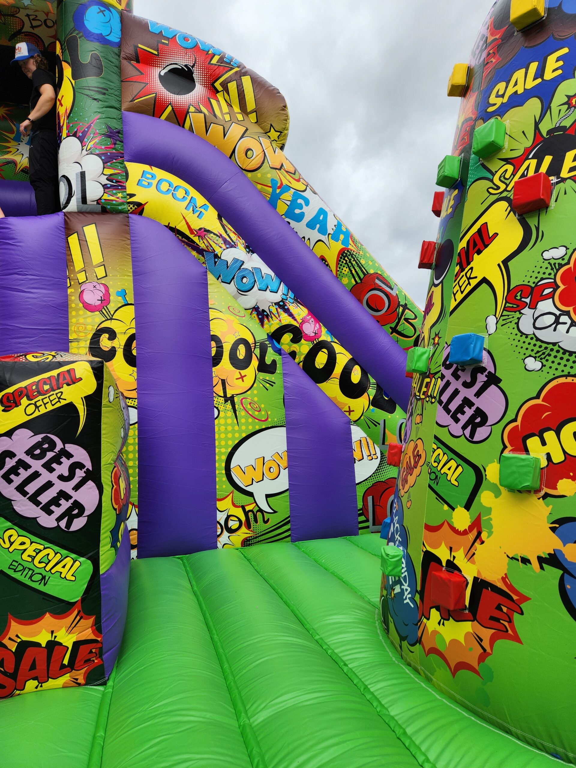 Ohromný hrad v komiksovém stylu. Hrad má velkou skluzavku, skok do prostoru, lezecký kužel,