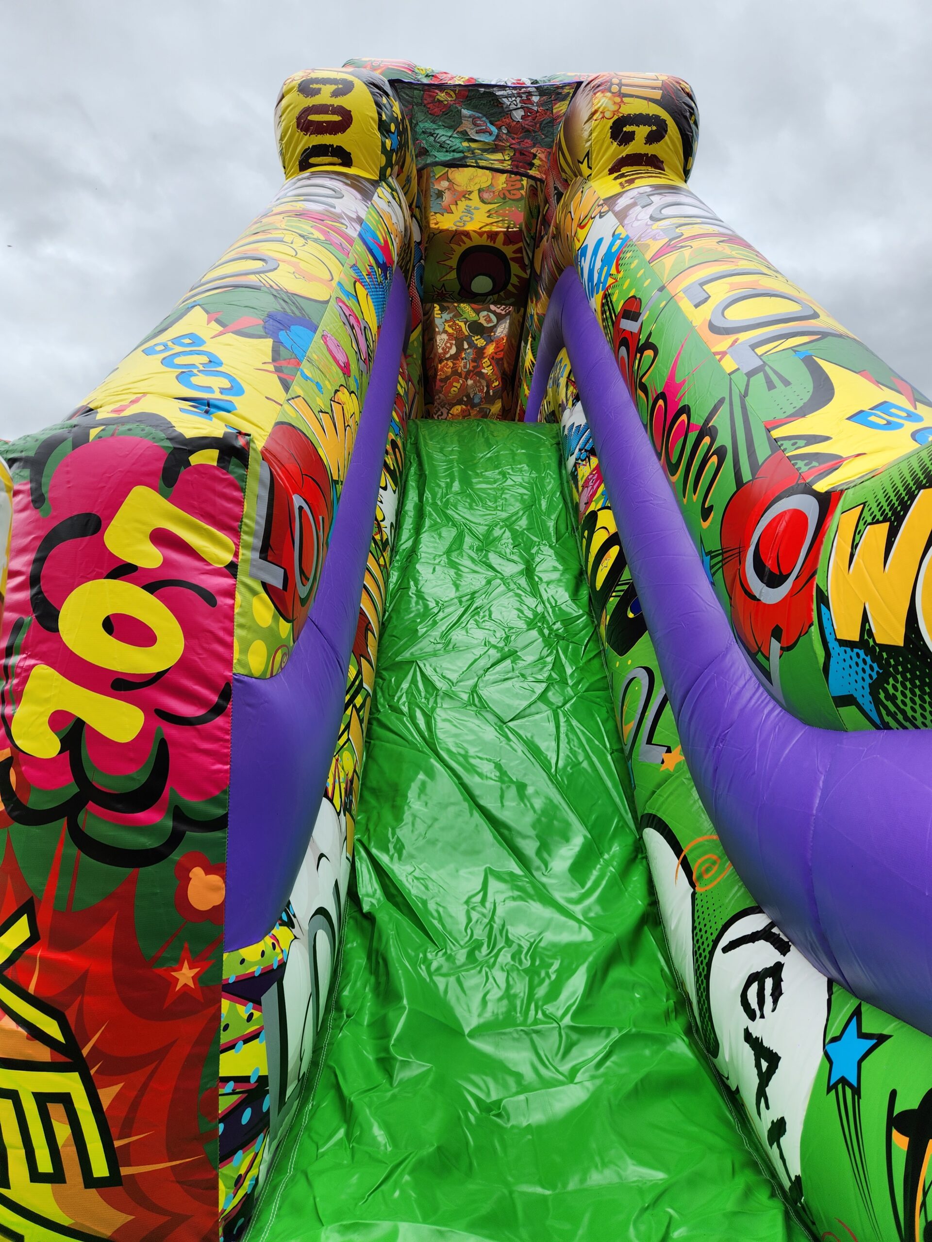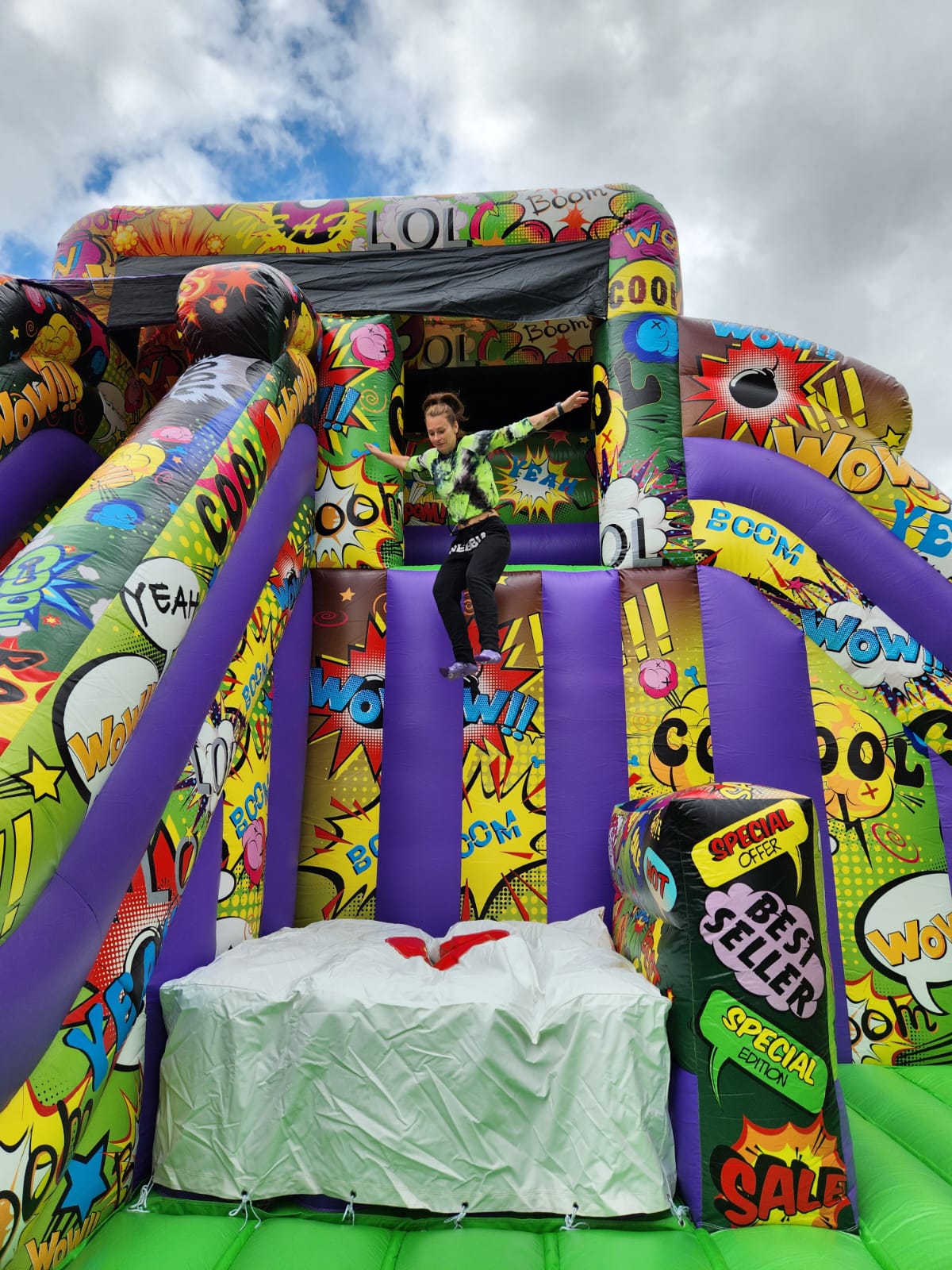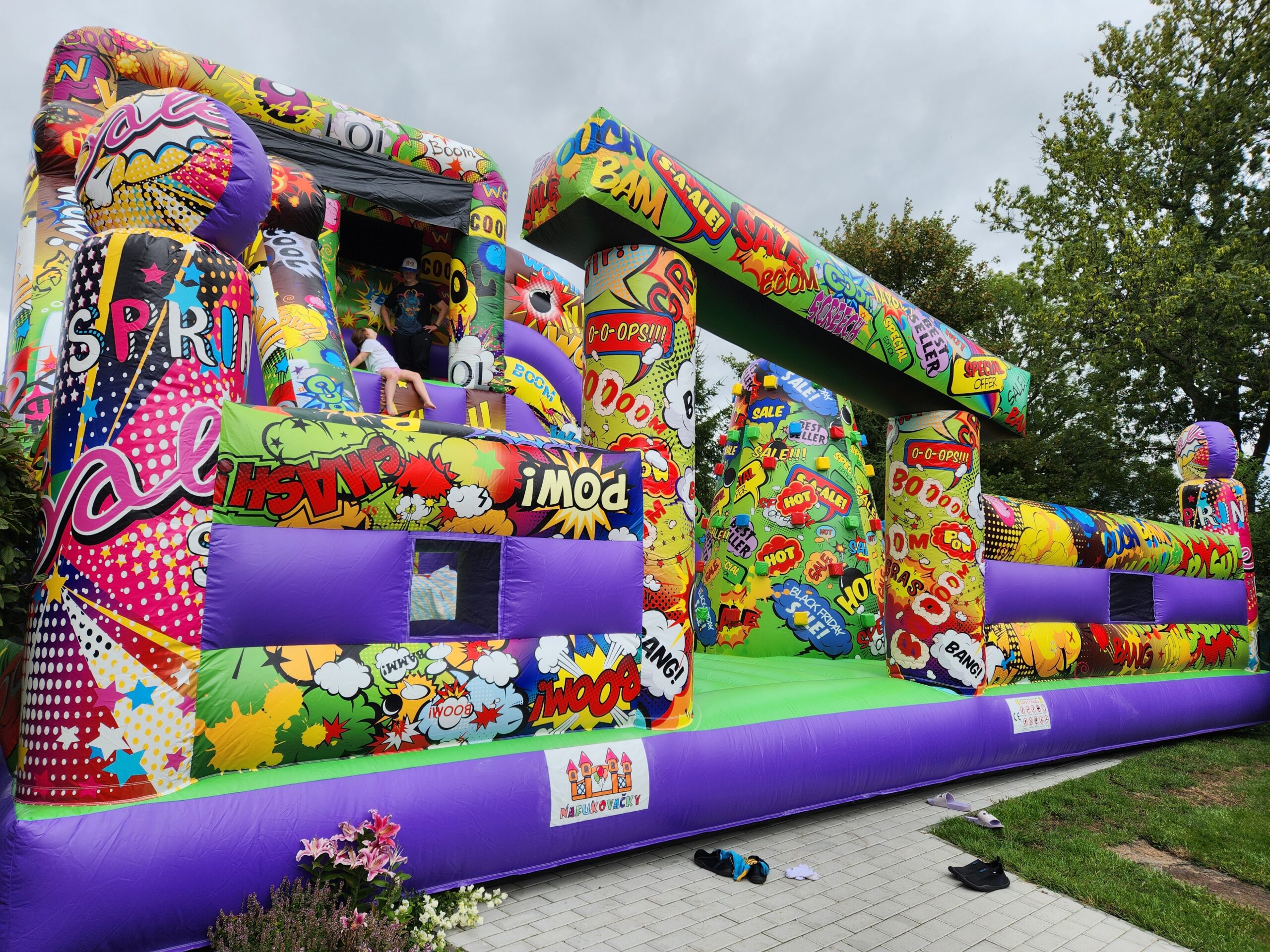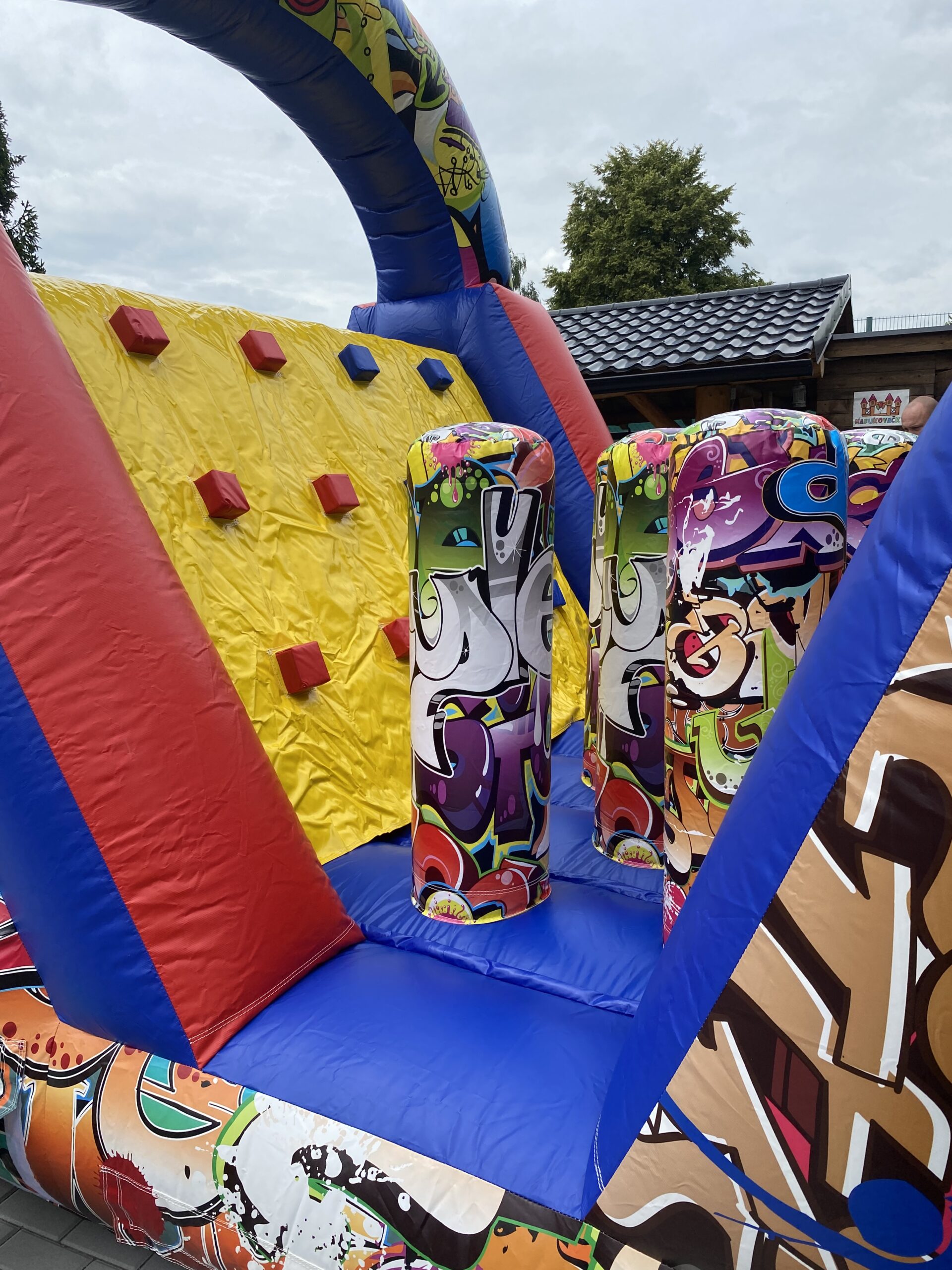 Ohromný hrad v komiksovém stylu. Hrad má velkou skluzavku, skok do prostoru, lezecký kužel,