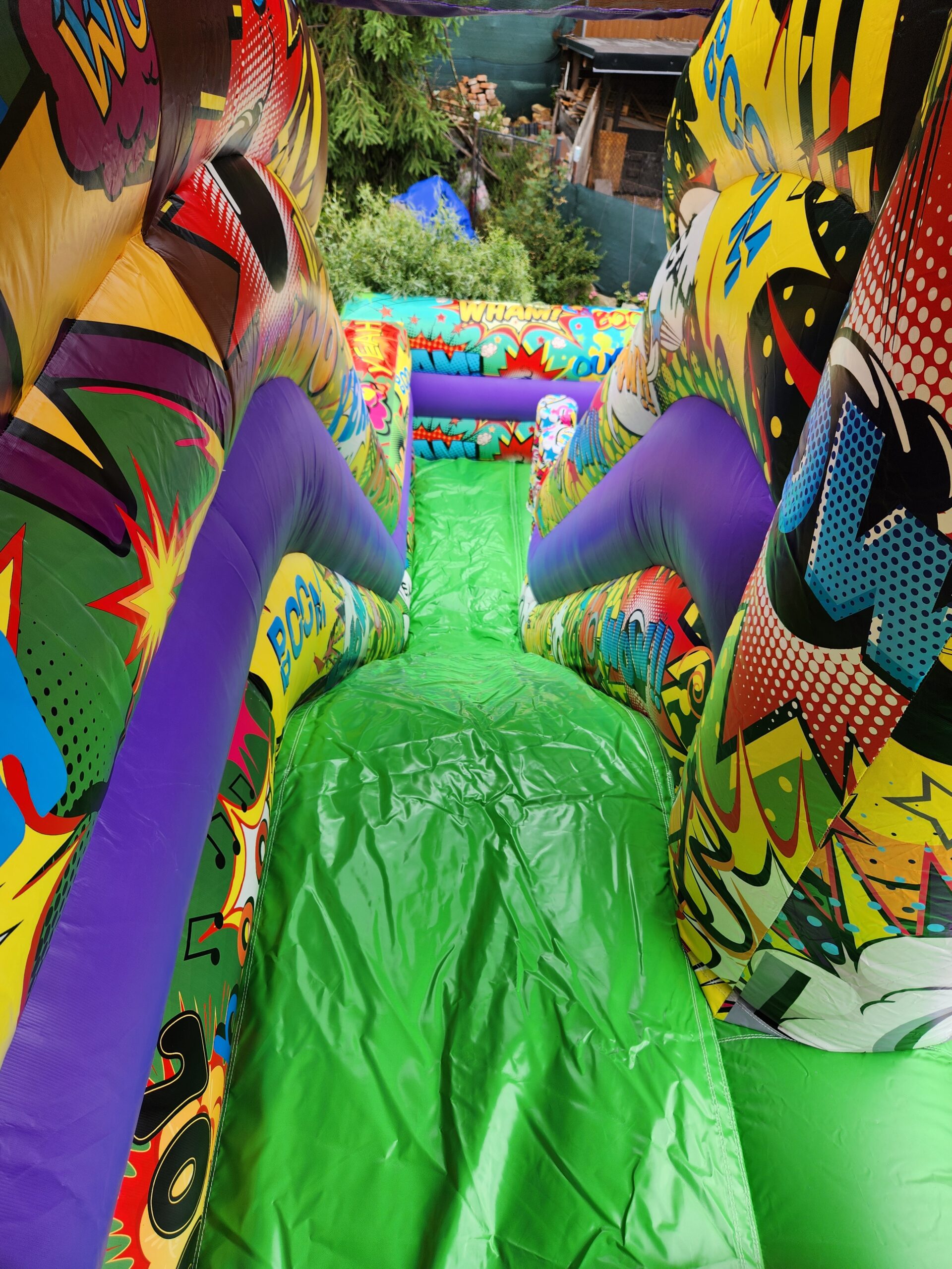 Dlouhá překážková dráha v originálním stylu graffiti.