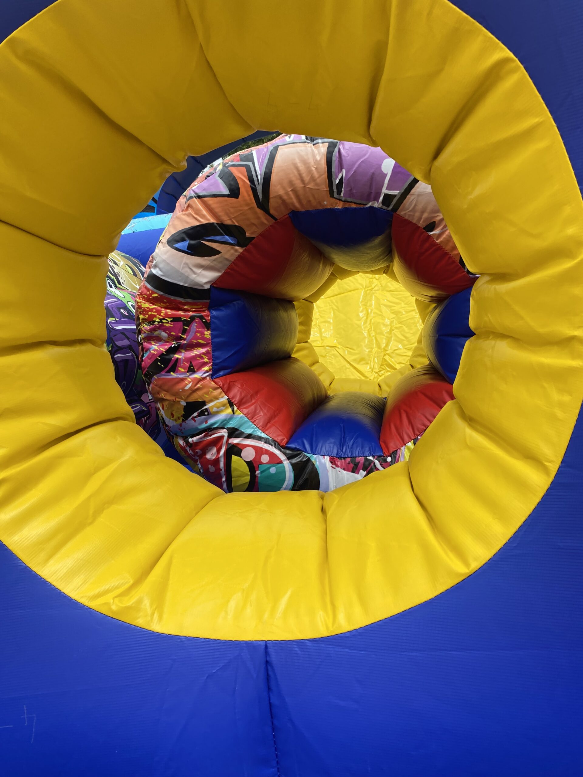 Veselý Mimon má plochu na skákání, skluzavku a prolézací tunel.